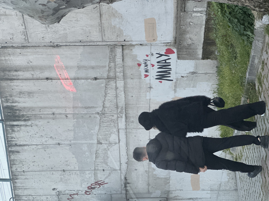 The image depicts an outdoor urban scene in Bakırköy, Turkey, featuring two individuals walking along a paved surface next to a substantial concrete wall. The environment consists of a large, weathered concrete retaining wall that occupies the majority of the background. The wall exhibits multiple shades of grey, indicating dirt streaks and water run-off patterns. A metal fence or railing is visible along the top edge of the wall. Graffiti is present on the wall: on the left, the word "CURSE" is spray-painted in red, oriented diagonally downwards. On the right, two instances of the name "MANAY" are painted in black, stylized letters, surrounded by red heart symbols, on a lighter, possibly patched section of the wall. A rectangular, bright red light reflection is visible on the upper right portion of the wall. Below the wall, a narrow strip of green grass and weeds separates it from a grey paved walkway. A tree trunk with mottled bark is partially visible on the far right of the frame, emerging from this green strip. Two individuals are positioned in the lower-middle of the frame, observed from behind, walking from left to right. The individual on the left, identified as male, wears a dark, possibly black, puffer jacket, dark trousers, and dark athletic shoes. His hair is short and dark. The individual on the right, identified as female, wears a dark, possibly black, furry or shaggy jacket, dark wide-leg trousers, and a dark, possibly bucket-style, hat. She carries a small, dark, structured handbag in her right hand, which hangs at her side. Her shoes appear to have white soles. Both individuals are walking in close proximity, side-by-side, suggesting shared movement. The overall lighting is diffused, consistent with an overcast day.