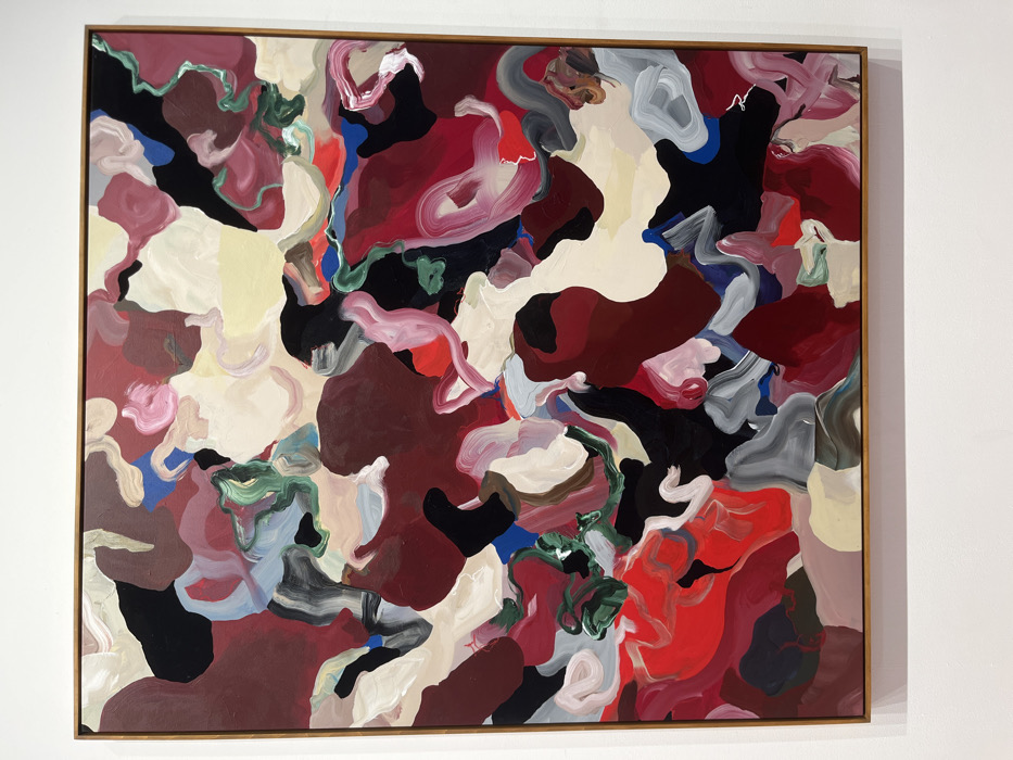 A vertical, framed abstract painting hangs centrally on a plain white wall, characteristic of an indoor gallery or museum environment. The artwork features a dense composition of organic, curvilinear shapes and fluid forms. The color palette includes deep reds, maroons, black, cream, light yellow, light blue, green, pink, and various shades of grey, which overlap and intertwine, creating a sense of depth and movement. The painting is enclosed by a thin, light-colored wooden or metallic frame. No individuals, additional subjects, or specific actions are depicted or observed within the scene. The uniform lighting suggests an exhibition space. The precise location within Paris, France, cannot be determined from the visual information provided.