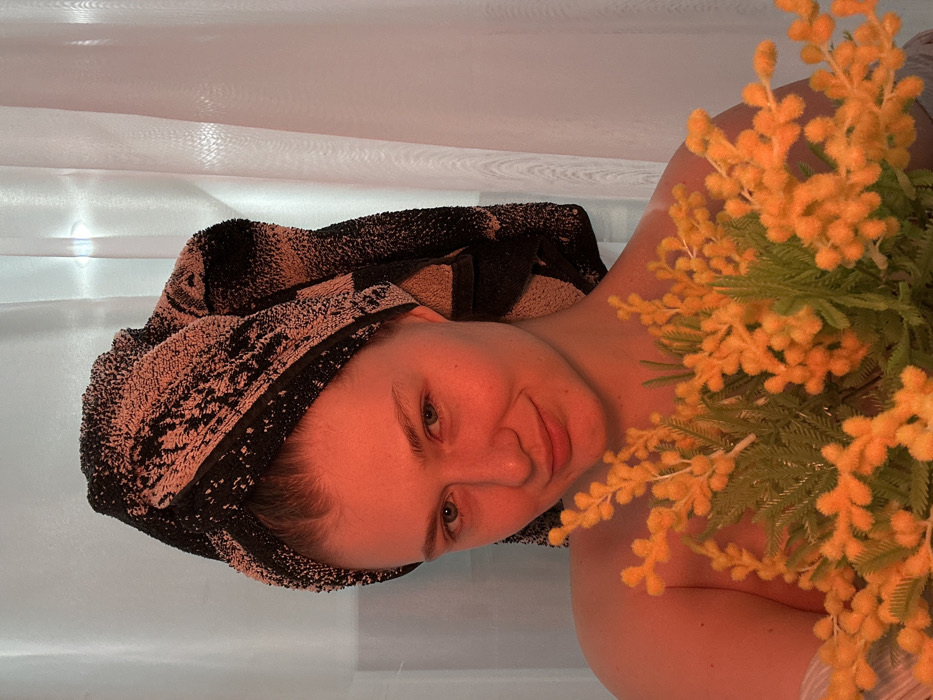 A light-skinned female individual is depicted in an indoor, chest-up portrait taken in Matyushino, Russia. Her hair is wrapped in a dark-colored towel with lighter patterns. She has light-colored eyes, visible freckles on her nose, and a slight smile, gazing directly at the camera. Her bare shoulders are visible, and her skin is strongly illuminated with a reddish-orange hue. In the lower foreground, she holds a bouquet of bright yellow, fluffy flowers, consistent with *Acacia dealbata* (mimosa), which partially obscures her lower chest. The background consists of light-colored, possibly sheer, curtains.