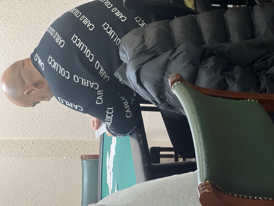 - "A bald man wearing a black sweater with repeating white "CARLO COLLUCCI" text is seen from the side, holding playing cards over a green table" by FM-PhdGF3, licensed under CC BY 4.0