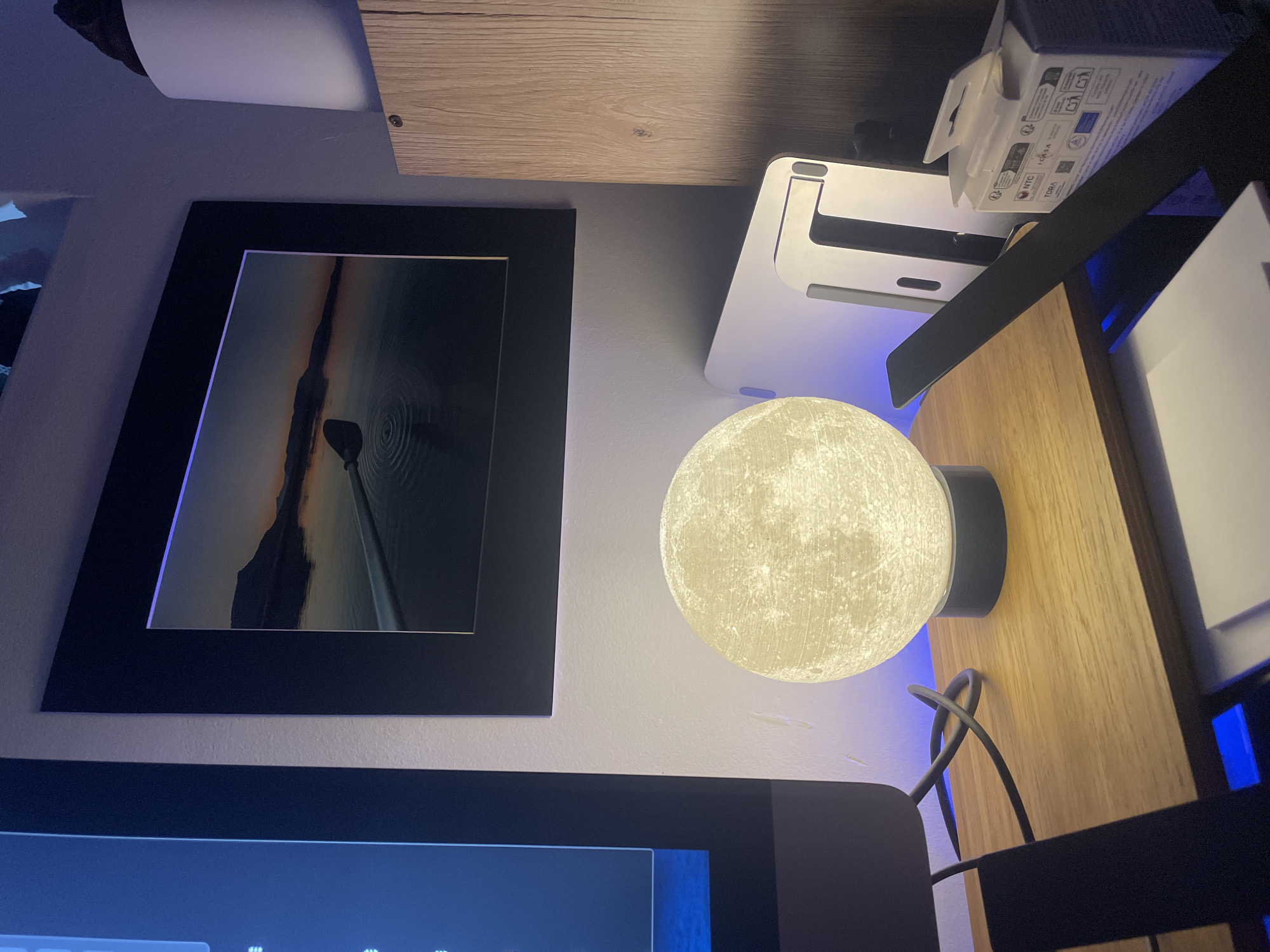 A close-up shot reveals a collection of items arranged on a desk or shelf. A framed picture, with a black frame, hangs on a white wall. To the right of the picture, a spherical moon lamp with a textured surface emits light. A white laptop stand and a product box sit on a light-colored wooden shelf. The corner of a computer monitor is visible in the foreground. A black cable from the moon lamp is also visible. The location is not determinable from the image.