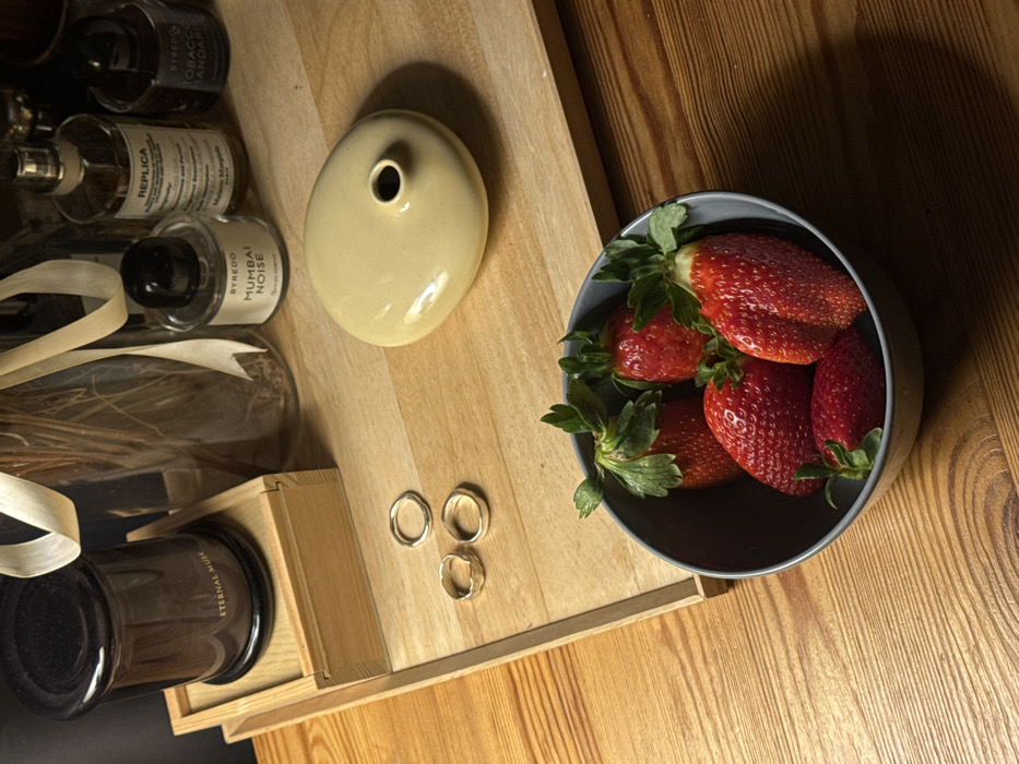 The image displays a wooden surface with various items. Perfume bottles line the left edge, beside a vase. Three rings are near the center. A bowl of strawberries sits on the right edge. The composition has a warm, natural light and evokes a sense of relaxed domesticity.