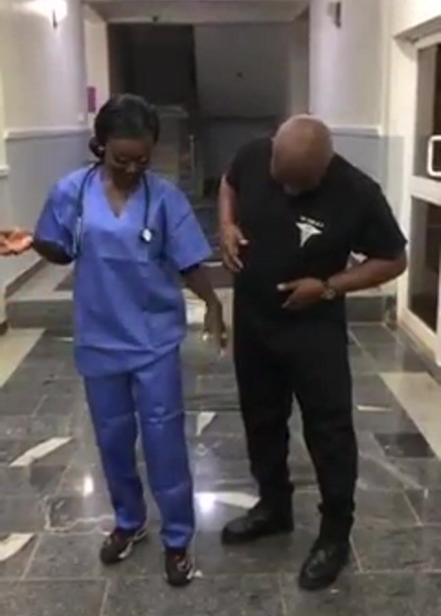 Two individuals, a woman and a man, stand in a hallway. The woman is dressed in blue scrubs with a stethoscope around her neck, and she is wearing sneakers. The man is dressed in black scrubs, with the Rod of Asclepius symbol visible on the chest, and black boots. They are both smiling. They stand on a granite-tiled floor. In the background, there are off-white walls, a black staircase, and a frosted glass door.