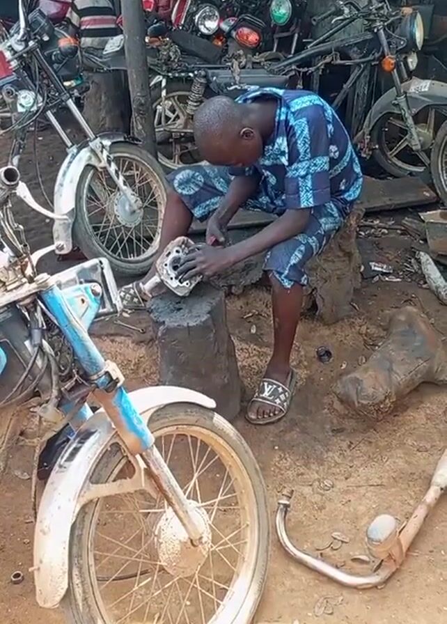 A young man is working on a motorcycle engine in what appears to be a repair shop. He is sitting on a large piece of wood, using a tool to work on a circular engine component. The man is wearing a blue patterned shirt and shorts, and sandals. In the background, several motorcycles are parked, some in various states of disrepair. The shop is cluttered with motorcycle parts. The ground is dirt, and a motorcycle exhaust pipe lies nearby.
