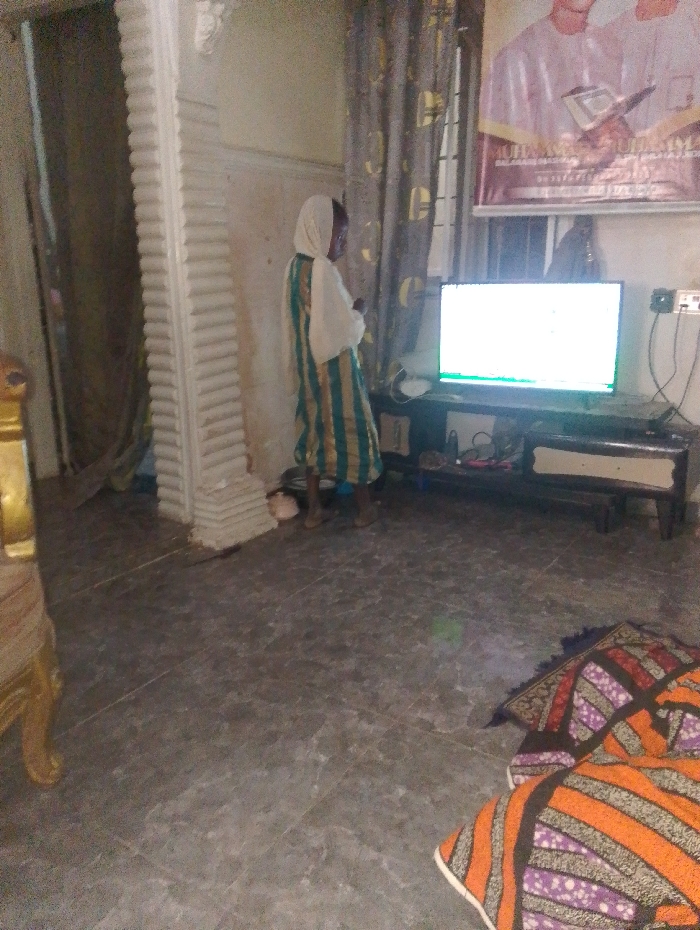 An elderly woman wearing a hijab and a striped dress stands in a living room next to a fluted pillar. A TV screen with a bright display sits atop a dark wooden stand against a window. A poster hangs above the TV. Curtains frame the window. The floor is covered in patterned tiles. A colorful patterned rug lies near the bottom right corner. Part of a gold-colored chair is visible on the left. A power outlet with a charger is on the wall next to the TV.