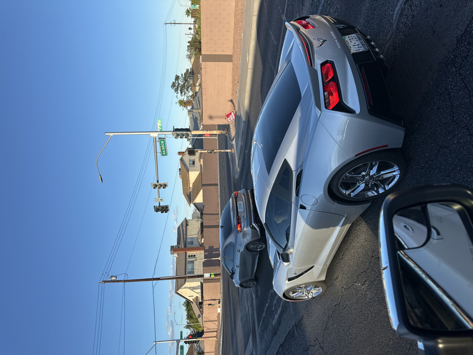 The image depicts an intersection in Las Vegas, Nevada, specifically Rainbow Boulevard and Malta Drive, under a clear blue sky with minimal cloud cover, during what appears to be late afternoon or early evening based on the lighting and shadow direction. In the immediate foreground on the lower left, a rearview mirror of a white vehicle is visible, indicating the perspective of the photographer. In the midground, a silver Chevrolet Corvette (C7 generation) is prominently featured, stationary, facing away from the camera. The vehicle has Nevada license plate "964-ZBP" and polished chrome wheels. The driver is faintly visible through the tinted rear window. Behind the Corvette, a gray Kia Forte GT-Line sedan is also stopped, displaying Nevada license plate "020-H71". Overhead, traffic signals are visible; the lights indicate a green signal for cross-traffic on Malta Drive, with a red signal for vehicles on Rainbow Boulevard. Street signs clearly display "RAINBOW" and "MALTA". The surrounding environment consists of single-family residential houses, mostly two stories, set back behind a peach-colored concrete block wall lining the street. Utility poles and overhead power lines are present. A partially visible red and white "FOR SALE" sign leans against the block wall on the right side of the frame. The road surface is asphalt.