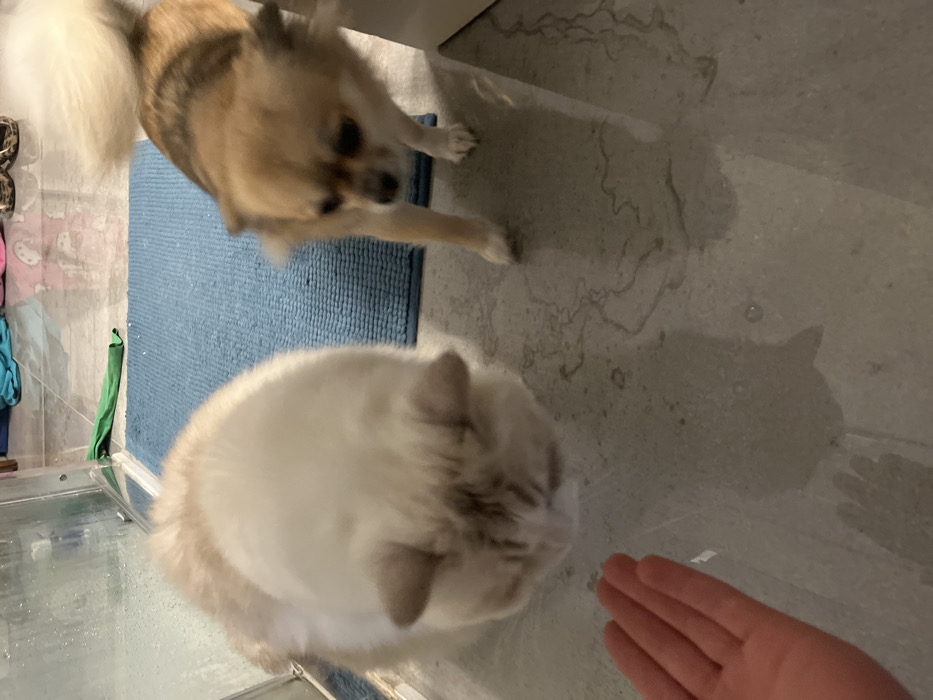 A domestic scene is captured in a tiled room, identified as a bathroom, in Erstein, France. In the foreground, a human's left hand is extended, palm upward, towards a light-colored domestic feline (cat) with darker markings on its face and ears. The cat's head is lowered, facing the extended hand. To the right of the cat, a small domestic canine (dog) with tan and brown fur and an upward-curled, bushy tail stands on a blue, ribbed bath mat. The dog's head is oriented downwards and slightly left, towards the floor or the cat. The floor is light grey and shows visible water droplets and streaks. A clear glass shower enclosure is partially visible on the left, with condensation. In the blurred background, green fabric and other items are discernible on the floor behind the mat.