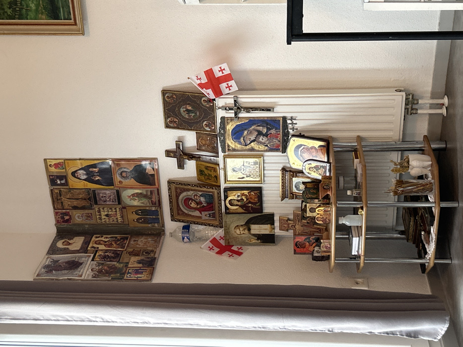 This is an interior view of a room located in Strasbourg, France. The scene depicts a devotional corner organized with numerous Orthodox Christian icons and religious artifacts. The walls, painted a light off-white, meet at a corner on the left. A large, folded display of multiple icons, depicting various saints, Christ, and the Theotokos, is mounted high in this corner, extending across both wall surfaces. Below this, on the right wall, an assortment of framed and unframed icons is arranged. These include a prominent framed icon of the Theotokos and Child, a brown wooden crucifix, and a darker, ornate framed icon. A small Georgian flag, featuring a white field with a large central red cross and four smaller red crosses in its quadrants, is pinned to the wall adjacent to a white vertical panel radiator. Another metallic crucifix is mounted directly on the radiator. A three-tiered, corner-fitting shelf unit, constructed with light-colored wooden or laminate shelves and silver metallic supports, occupies the lower foreground. The top shelf displays several small icons, a clear plastic water bottle, and various small containers. The middle shelf holds a white book and additional small objects. The bottom shelf contains stacks of items resembling books or wooden boxes, a decorative white vase or holder containing numerous thin wooden sticks (likely incense or candles), and a piece of white lace. A grey curtain is drawn to the side of a partially visible window on the far left, providing natural illumination. The floor surface is a uniform grey.