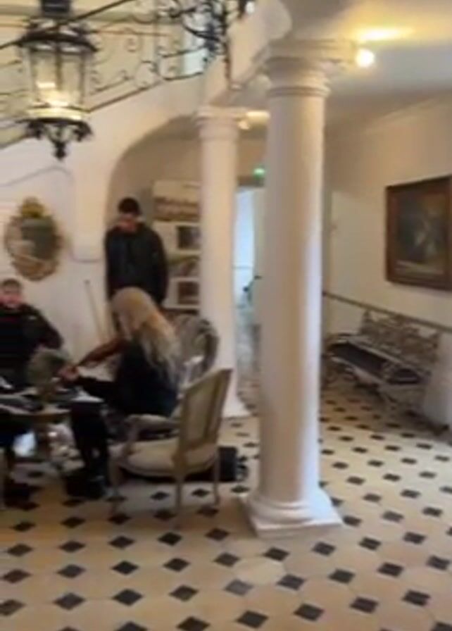 tiled foyer with white columns in an indoor area with a staircase and ornate lighting. Four people are visible. One is standing, while the others are seated in ornate chairs playing instruments - a flute, a violin, and a clarinet. A man is standing in the background. There is photography equipment on the right side of the frame.