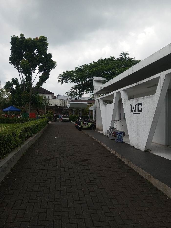 The scene is an outdoor area in Daringbadi, India, observed under an overcast, grey sky. A dark grey paver block pathway, laid in a herringbone pattern, extends from the foreground towards the mid-ground. To the left, a landscaped strip features low green hedges bordering a grassy area. Beyond this, a blue canopy is visible, under which several individuals appear to be gathered. Multiple large trees with dense green foliage are present on the left and mid-ground, with distant, light-colored buildings partially visible in the background. On the right side of the pathway, a stark white, modern-style building with a flat roof and angular, triangular facade elements stands. The letters "WC" are stenciled in black on one of these white sections. Positioned against the base of this building are several small, wheeled vendor carts, one of which displays a blue sign with white lettering, partially reading "BASO & CILOK". A line of approximately five light green, electric scooter-type vehicles are parked adjacent to the building. In the mid-ground, near the parked scooters and a white, open-sided utility vehicle, several individuals are observed congregating. No specific actions or interactions among the individuals are clearly discernible.