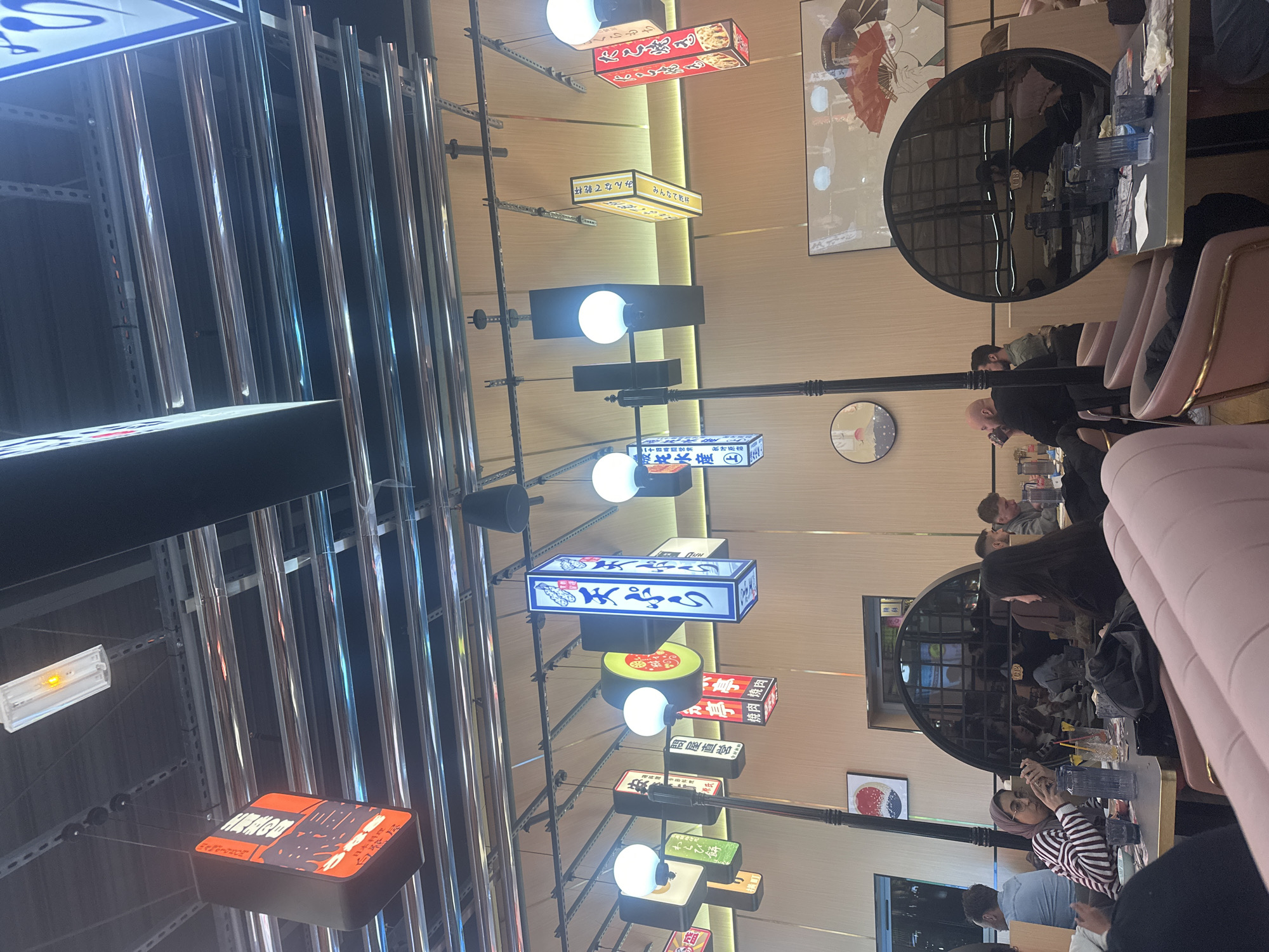The image displays the interior of a Japanese-themed restaurant located in Clamart, France. The ceiling features an exposed industrial aesthetic with black metal tracks, from which numerous illuminated signs displaying Japanese script in various shapes (rectangular, lantern-like, circular) and colors (red, blue, yellow, orange) are suspended. White globe lights and a linear fluorescent fixture with an amber glow are also integrated into the ceiling. The walls are clad in light wood paneling, adorned with Japanese artwork, including a circular piece depicting a red sun motif and a large framed print of a traditional Japanese figure holding a red fan. Dark-framed arched reflective panels are embedded in the walls, mirroring portions of the dining area and patrons. The restaurant is furnished with tables featuring light-colored tops and dark edges, accompanied by diverse seating, including plush pink upholstered chairs with gold-toned frames and matching booth seating in the foreground. Several individuals are seated at tables. In the mid-ground, a woman wearing a striped shirt and a light brown hijab is actively viewing content on a smartphone held with both hands. She is seated across from another woman with long dark hair wearing a black top. Their table holds multiple drinks, including yellow liquids in glasses, and a blue ribbed plastic bottle. Further within the restaurant, a bald man in a dark shirt is seen in profile, raising a glass to his lips, while other patrons are visible dining and conversing. The scene conveys a casual, modern dining environment with pronounced East Asian decorative elements.