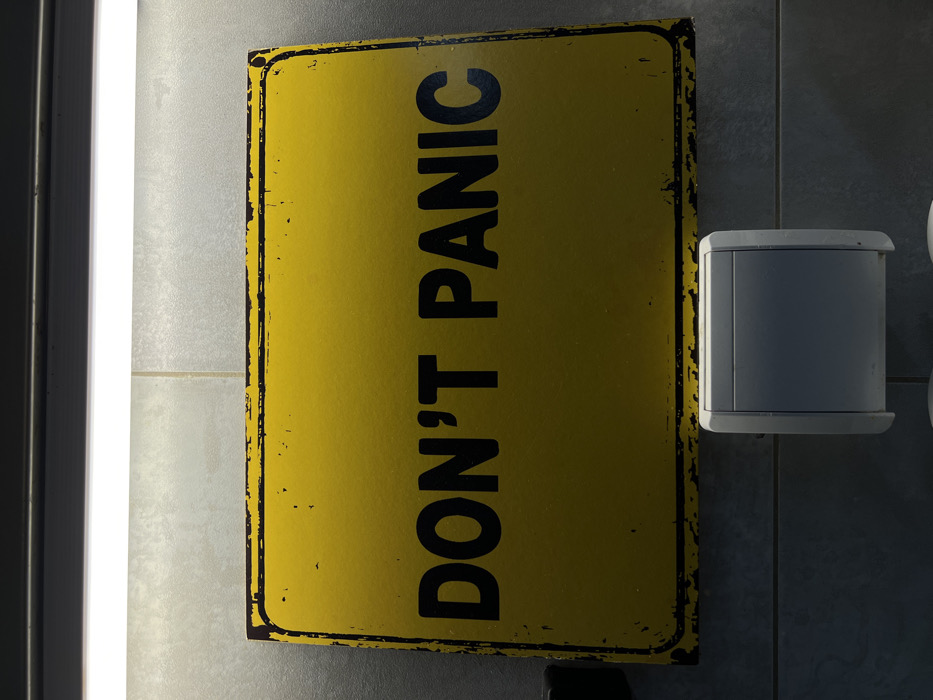 The scene depicts an interior restroom wall in Budva, Montenegro. A prominent rectangular yellow metal sign is centrally mounted on a wall composed of light-colored rectangular ceramic tiles with visible vertical grout lines. The sign displays the phrase "DON'T PANIC" in bold, black, sans-serif capital letters. Its edges show simulated wear, characterized by irregular black chipping, indicative of a distressed or vintage finish. Above the sign, a horizontal linear light fixture provides downward illumination. Directly below the sign, and horizontally centered, is a white wall-mounted plastic toilet paper dispenser. No individuals, actions, or interactions are present in the image.