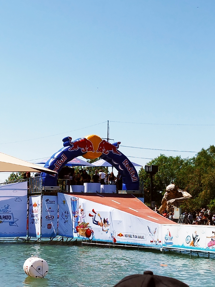A scene featuring a Red Bull event by the water, with a ramp leading into the water
