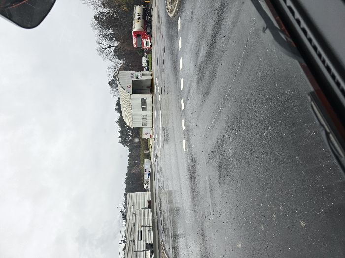 The image depicts an industrial or commercial yard in Haguenau, France, under an overcast sky, with the ground wet from recent precipitation. The perspective is from inside a vehicle, evidenced by the dashboard and windshield wipers in the lower frame. The foreground shows dark, wet asphalt with white dashed lines marking a road or turning area. In the midground, a white corrugated metal building with a curved roof and an open archway entrance stands prominently. To its immediate right, a red semi-truck with a white tanker trailer is parked, oriented towards the right side of the frame. The tanker bears dark lettering that appears to read "JIKE" or "JAKE." To the left of the curved building, a large stack of white, rectangular structures or materials is visible. Further in the background, additional smaller white structures and containers are present. The background is dominated by a dense line of trees, indicating a wooded area or forest bordering the facility. No individuals are visible within the scene.