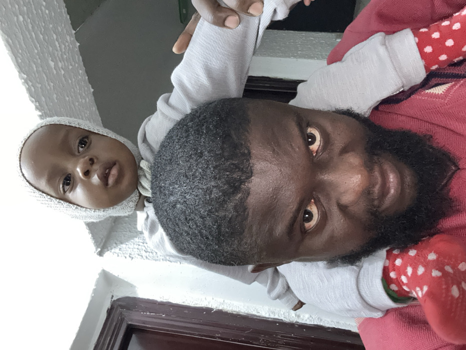 A man with dark skin and a beard holds a baby. The man looks at the camera with open eyes. The baby has dark skin and wears a knitted bonnet. They are close together, likely indoors. The background includes parts of a white wall, door, and possibly a bed or blanket. The image is tilted, causing a slight distortion.