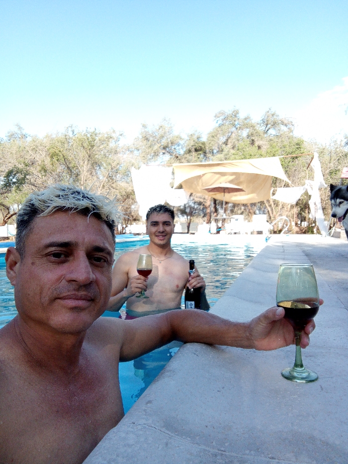 Two shirtless men are in a swimming pool. The man in the foreground is holding a glass of red wine while resting his arm on the pool’s edge. The man in the background is also holding a glass of red wine, along with a bottle. Behind them, there's a canopy structure, trees, and a dog. The sky is clear blue. They seem to be enjoying a sunny day by the pool.