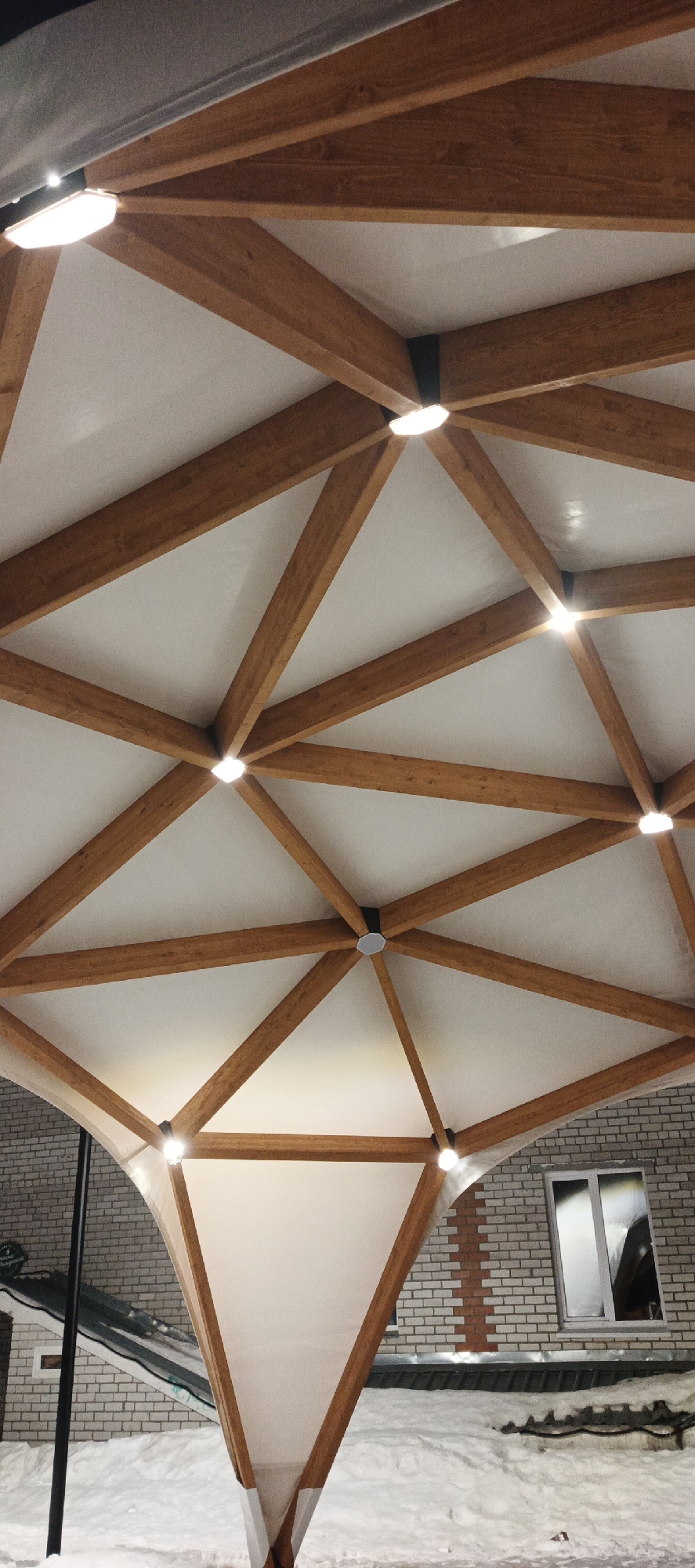 view looking up at a uniquely designed structure in what appears to be an outdoor setting, potentially in the city of Nar'yan-Mar, Russia, given the request. The structure features a white, possibly fabric, ceiling stretched between a framework of light-brown wooden beams arranged in a triangular pattern. At the intersections of the wooden beams, there are small, circular light fixtures, creating a lit interior. The wooden framework extends down to the ground, suggesting a pavilion-like design. Outside the structure, there is a brick building with a visible window. The ground is covered in snow, indicating a cold or winter climate. The lighting suggests it may be dusk or nighttime. The overall impression is that of a modern or artistic architectural piece placed in a cold-weather urban environment.