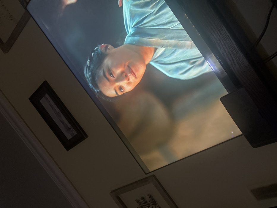 tilted view of a television screen displaying a woman wearing a light blue garment. Her face is prominent, with a focused expression. Surrounding the screen are sections of walls with framed pictures. The lighting is dim, creating a shadowed effect. A dark-colored object, possibly a part of the TV or a speaker, is visible on the right edge.