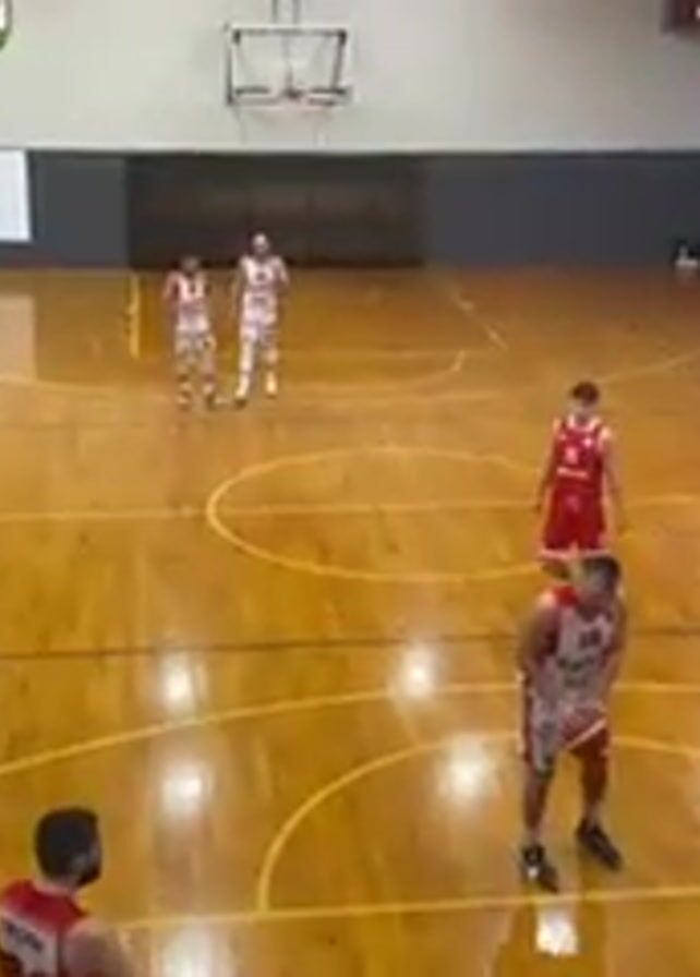 A basketball game is underway on a glossy wooden court with clear markings. Two teams, one in white with red trim and the other in red with white trim, are positioned around the free-throw line. A player in the white uniform with number 10 is in the process of shooting a free throw. His arms are extended, and the basketball is visible in mid-air. The shot goes in. Spectators are visible in the stands on both sides of the court. One of the spectators appears to be filming the game on their cell phone.