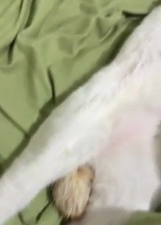 white cat lying on its side on a green bedsheet. Initially, the lower part of the cat's body and tail are visible. The camera then pans along the length of the cat's body to its head. The cat's fur appears soft and fluffy, and its ears are visible. The overall lighting is subdued, contributing to the intimate and relaxed atmosphere of the scene.