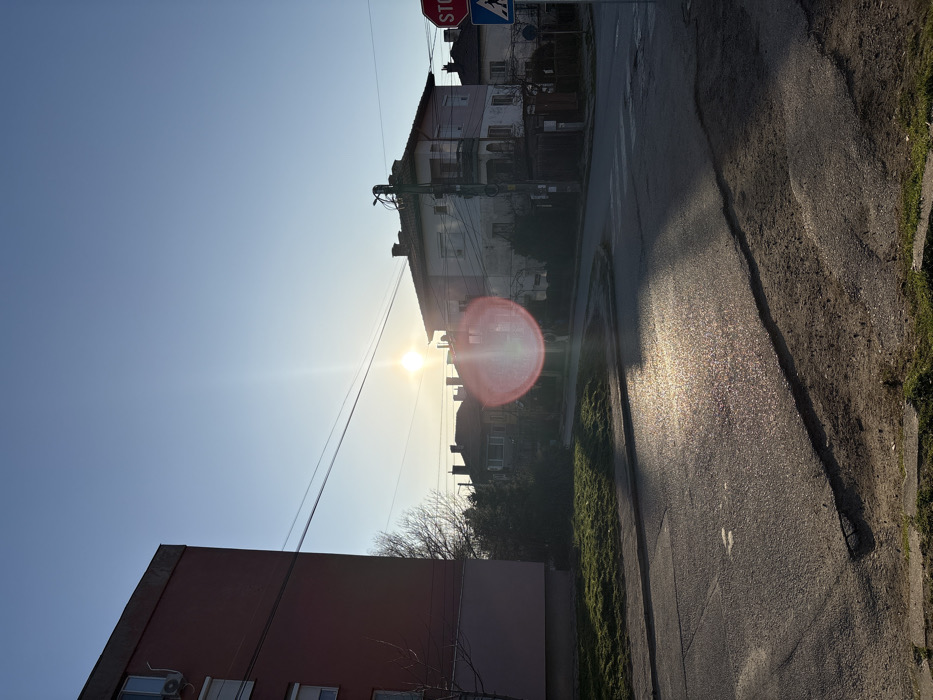 - "The scene depicts a street view in Kyustendil, Bulgaria, under clear blue skies with the sun positioned low in the frame, causing significant lens flare and bright reflections on the road surface" by FM-WHBY53, licensed under CC BY 4.0