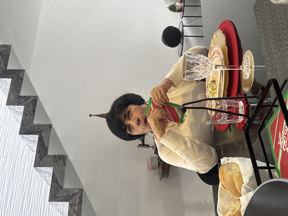 An older woman with short black hair and a party hat is at a dining table. She is holding a small, striped party favor to her mouth. The table is set with layered plates and crystal glasses. A bread basket is in the foreground. Stairs are visible to the left and shelves holding various objects are in the background.