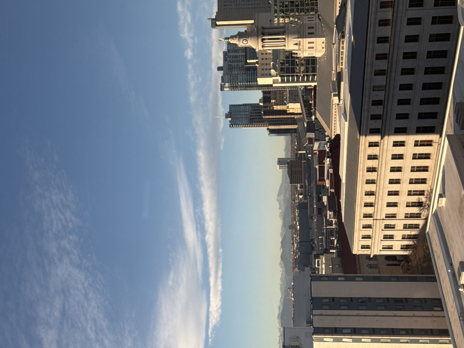 cityscape against a clear blue sky with wispy clouds. Tall buildings dominate the skyline, ranging from modern skyscrapers to older, ornate structures. The buildings are densely packed together, creating an urban vista. Distant mountains are visible in the background, adding depth to the scene. The overall impression is of a vibrant, thriving urban environment with a backdrop of natural beauty.