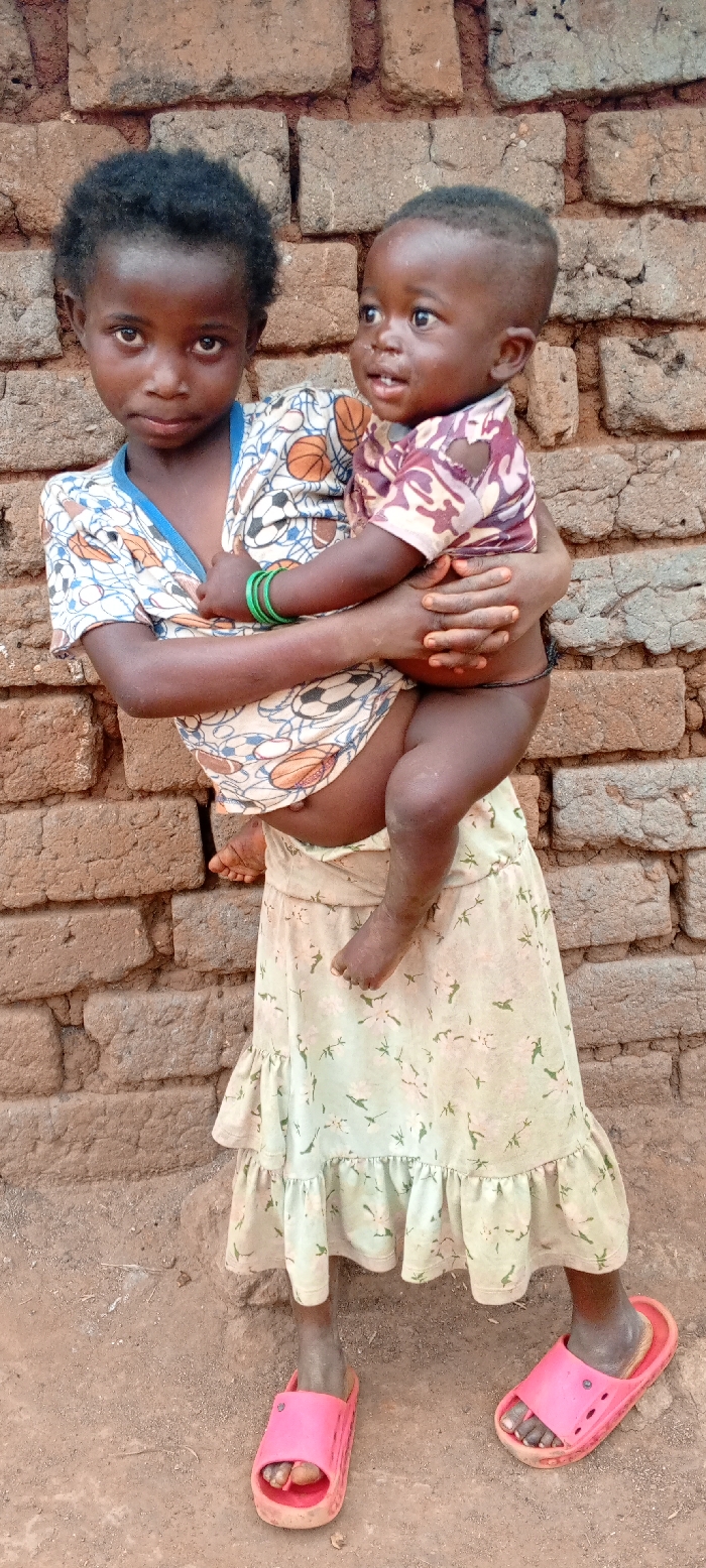 Two children, a girl and a baby, stand in front of a brick wall. The girl, wearing a light floral dress and pink sandals, holds the baby in her arms. She has short, dark hair and gazes directly at the viewer. The baby wears a patterned shirt and stares to the side. Both children appear to be of African descent. The backdrop suggests a simple, possibly rural, environment.