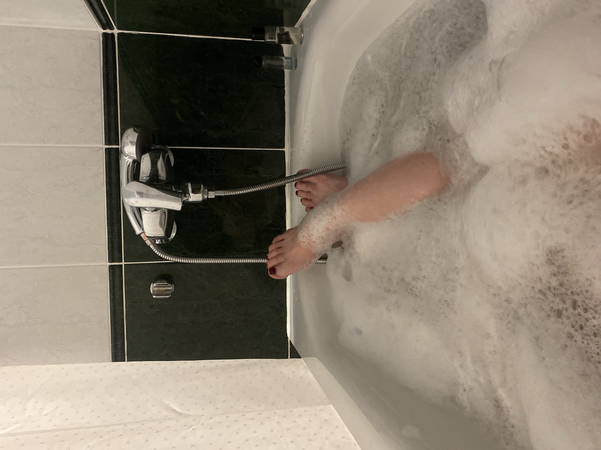 A top-down view depicts a bathtub filled with bubbly water. A person's leg and feet are visible in the suds, with red nail polish on the toes. The bathroom has tiles in alternating dark green and light gray, with a silver faucet and shower hose attached to the wall. A white shower curtain hangs below. There are no indicators to suggest the location is in Saint Petersburg, Russia.