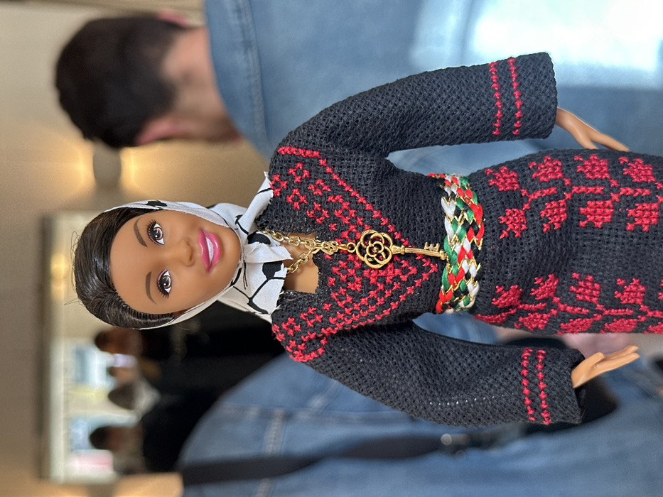 A Barbie doll with dark skin and dark hair stands in an indoor setting. She wears a white headscarf with black geometric patterns, a long-sleeved black dress featuring extensive red tatreez embroidery in geometric and floral motifs, and a braided belt incorporating green, white, red, and gold colored threads. A gold-colored chain necklace with a decorative gold key pendant is visible around her neck. The blurred background shows the back of a male figure in a denim jacket on the right, and indistinct reflections of multiple individuals on the left, possibly in a mirror. The specific location within Paris, France, cannot be determined from the image.