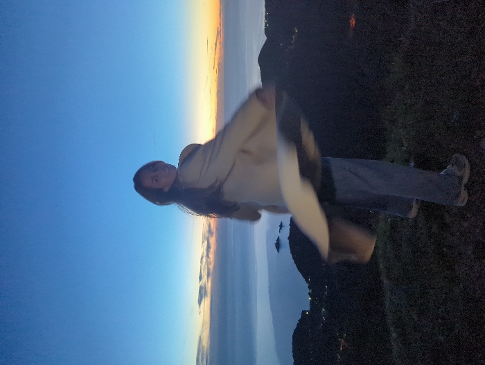 A woman stands on a grassy slope at dusk or dawn. She wears jeans, sneakers, and a tan jacket. Her long hair flows down her back. The sky is a gradient of blue to orange with a sliver of water visible in the background. The landscape is dark, with hints of vegetation. The photo is rotated counter-clockwise.