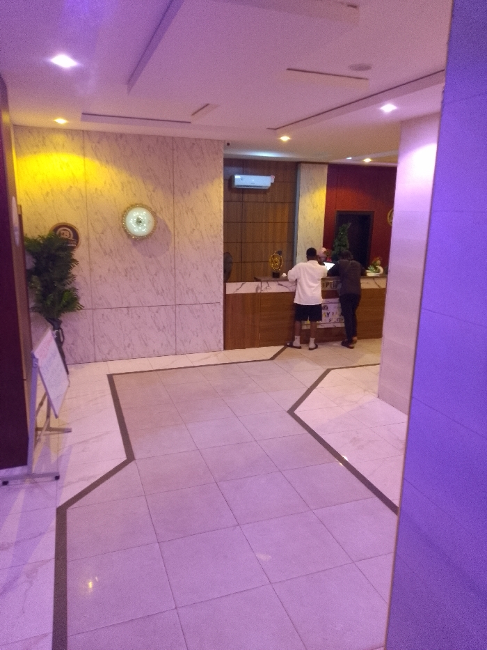 A hotel lobby with light marble flooring and dark trim leads to a reception desk. Two people are at the counter. Behind the reception, the wall is paneled with wood, and an air conditioning unit is mounted. To the left of the reception, the wall is white marble with gold-toned decor. A plant stands next to a sign on a metal stand. The lighting is bright, with overhead fixtures. A purple hue casts across the right side of the image.