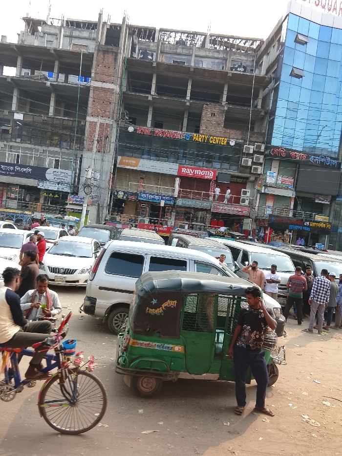 The image captures a busy, sunlit street scene in the city of Tarabo, Bangladesh. In the foreground, a blue bicycle rickshaw is positioned on the left, carrying a male passenger in a light-colored shirt who is looking down at an object in his hands. Adjacent to the rickshaw, a green three-wheeled auto-rickshaw is parked, with a male individual in a dark floral shirt and dark pants standing beside it, appearing to be engaged with a mobile phone. The midground is occupied by a line of vehicles, primarily white and silver microbuses and cars, indicating either parked vehicles or traffic congestion. Several male pedestrians are observed standing and walking among these vehicles. The background consists of multiple multi-story commercial buildings. A large, unfinished concrete and brick structure with exposed rebar is prominent on the left and center, towering over ground-level storefronts. Visible signs include "HOME RESTAURANT & PARTY CENTER" and "Raymond SHOP" in English, alongside various signs in Bengali. To the far right, a modern building with a blue glass facade features "SQUARE" partially legible at its top and a sign with Bengali text identifying "City Popular Hospital." The sky above is clear, and utility wires are visible traversing the upper part of the scene. The ground is paved but appears dusty in areas.