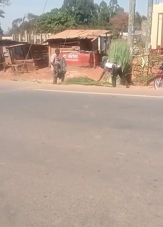 road next to which some people are standing by a pile of sugar cane. One man is holding a machete. A man on a motorcycle drives into the frame. Another motorcycle is parked in the background. A small building with a red sign reading "Airtel" is visible in the background. Trees and bushes are in the background. The sky is light blue.