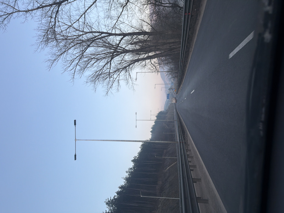 The image depicts a two-lane asphalt highway observed from the interior of a vehicle, presumably in the city of Kreta, Bulgaria. The sky, a gradient of pale blue transitioning to a light pinkish-orange near the horizon, suggests either early morning or late afternoon. The roadway, which appears recently paved, features a continuous white line marking the right shoulder and dashed white lines separating the lanes. Metal guardrails flank both sides of the road. On the left, a steep embankment is densely covered with slender, dark evergreen trees. A series of tall, metallic lampposts with horizontal twin-lamp fixtures line both sides of the highway, extending into the distance; their lights are off. On the right side of the road, beyond the guardrail, is a cluster of bare deciduous trees with visible branches and no foliage, suggesting a winter or early spring season. In the far distance on the highway, a light-colored box truck is visible traveling away from the camera. Beyond the truck, blue highway signs are discernible. Distant, hazy mountains or hills form the backdrop under the horizon. No individuals are present in the observable scene.