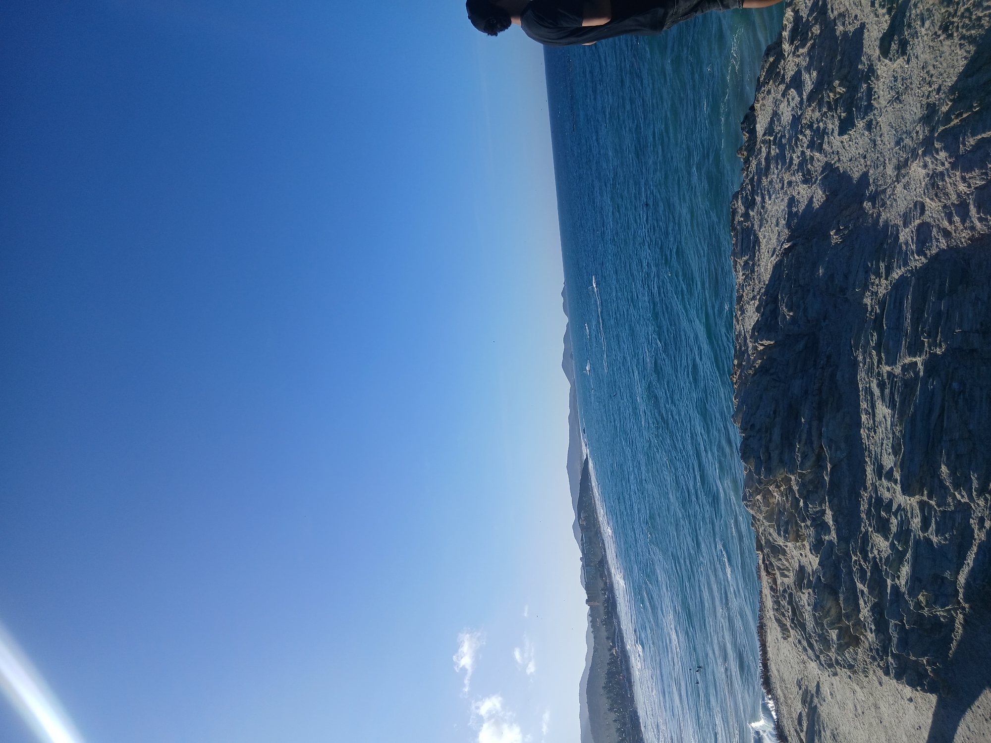 A landscape photograph shows a cliff-side view of the ocean on a sunny day. A person stands at the edge of the cliff at the top of the frame, with their back to the camera. The cliff face is textured and appears to be made of gray rock and sand. The ocean is a deep blue color with some white waves. In the distance, there are hills or mountains. The sky is bright blue and clear, with a few small clouds at the bottom of the frame. The sun's rays are visible on the lower left. The location is Los Colorados, Venezuela.