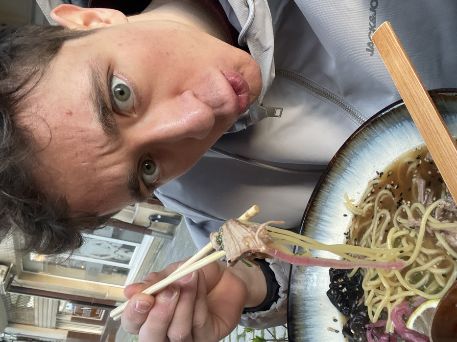 - "An outdoor scene in Plovdiv, Bulgaria, depicts a young adult male in a close-up, front-facing shot, holding chopsticks with food raised from a bowl of ramen" by FM-K8mpv1, licensed under CC BY 4.0