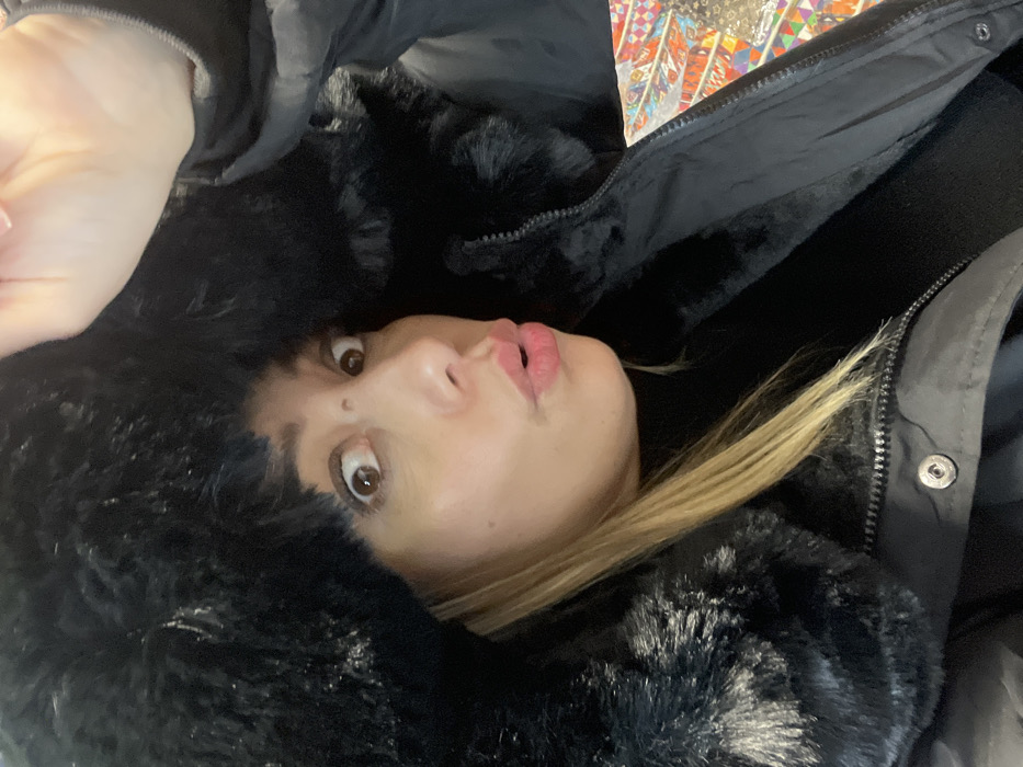 A woman in a black, fur-lined hood looks up at the camera with wide eyes and slightly puckered lips
