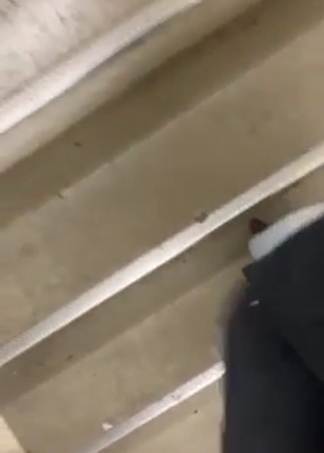 The video depicts a person descending a set of indoor stairs. The stairs are gray with silver or aluminum strips along the edge of each step. The person is wearing dark pants and a light-colored shirt. Brown shoes are visible. The camera is pointed downwards, capturing the steps and the lower part of the person's body as they move.