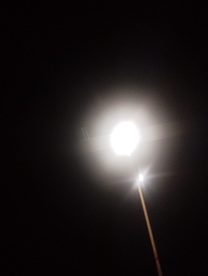 The image captures a nighttime scene in Unguwan Rimi, Nigeria. A primary, intensely bright, circular light source, consistent with a street lamp, is centrally positioned in the upper portion of the frame, emitting significant glare. A vertical pole, likely a street light support structure, extends diagonally upwards from the lower right corner, appearing to connect to or support this main light. A secondary, smaller, elongated light fixture is visible on this pole below the primary light. The surrounding environment is otherwise obscured by profound darkness, rendering all other objects, people, and specific actions indiscernible.