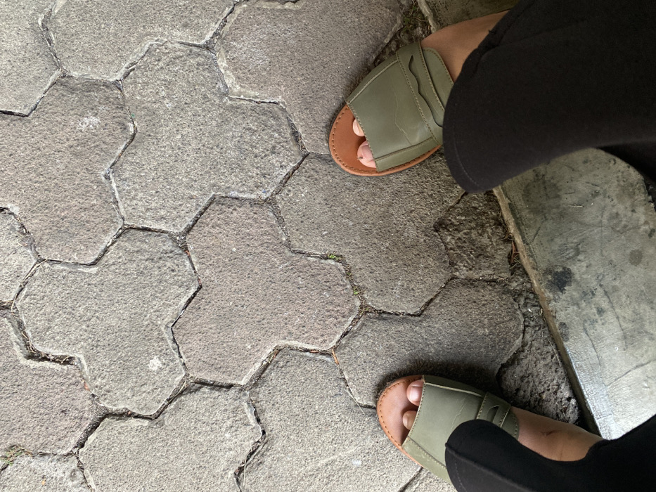 first-person, downward view of an individual's lower legs and feet on a paved outdoor surface. The subject wears black pants and olive-green, open-toe slip-on sandals with light brown soles. Both feet are visible within the sandals, with natural-colored toenails. The ground is composed of interlocking hexagonal concrete pavers in varying shades of light gray and brownish-gray, exhibiting wear and minor organic growth in the crevices. A dark gray concrete surface, possibly a curb or threshold, runs horizontally across the bottom edge of the frame. The scene is an unspecified outdoor pedestrian area in the city of Unknown, Unknown.