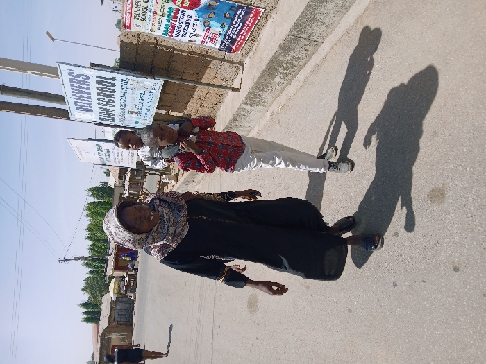 The image depicts an outdoor street scene in Ghanzi, Botswana, under clear skies with bright sunlight evident from prominent shadows. In the foreground, an adult woman and two children walk on a paved road. The woman, positioned on the left, is dark-skinned and wears a long black robe-like garment with gold trim on the sleeves, and a patterned headscarf featuring white, brown, black, and grey tones. She is smiling, revealing missing front teeth, and wears dark open-toed sandals. To her right, a male child, likely a pre-teen, with dark skin, wears a red and white checkered long-sleeved shirt and light-colored trousers, along with grey sneakers. He carries a younger child, a dark-skinned toddler wearing a light-colored long-sleeved top, seated on his shoulders. In the mid-ground on the right, parallel to the road, is a low concrete wall or sidewalk. Mounted on two dark poles above this wall is a white sign with "BELIEVERS' HIGH SCHOOL" in blue lettering. To its immediate left, another white sign, partially obscured, is visible. To the right of the "BELIEVERS' HIGH SCHOOL" sign, a red and white poster-like sign advertising "BELIEVER'S SCHOOL KG" (Kindergarten) is affixed to a brick wall. In the background, multiple utility poles with overhead wires are visible. Various single-story buildings, some with corrugated iron roofs, line the street. A market stall or vendor setup with a yellow umbrella is discernible in the left mid-background. A lone individual, dressed in dark clothing, walks away in the far left background. A line of tall, slender trees is visible in the distant background. The paved road shows minor surface irregularities and a few stains. Long, distinct shadows of the subjects are cast on the road, extending towards the viewer.