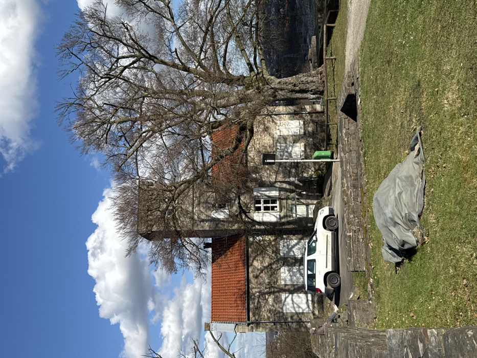 The scene depicts an elevated outdoor area in Hattingen, Germany, under a clear blue sky with scattered white cumulus clouds. Direct sunlight illuminates the environment, casting distinct shadows, indicative of late winter or early spring. The central structure is a historic, two-story stone building featuring a red-tiled gabled roof and a prominent square stone tower on its left. Multiple windows with white frames are visible on the stone facade, several of which have closed white shutters. To the left of the building, a white Skoda Yeti compact SUV is parked on a paved surface. A single individual, dressed in a light-colored jacket and trousers, is seated on a low stone wall to the left of the parked vehicle, facing towards it with their feet on the paved ground. In the mid-ground, a large, bare deciduous tree stands to the right of the building, its extensive network of branches intertwining with the tower and extending across the sky. A green waste bin is positioned near a slender pole between the parked car and a rustic wooden railing that delineates an elevated grassy area. In the immediate foreground, a grey tarpaulin-like cover forms a low mound on a patch of green grass. A partial stone wall, appearing as a remnant or ruin, is visible in the lower-left corner of the frame. A distant valley or urban landscape is discernible in the background, partially obscured by the bare tree branches.