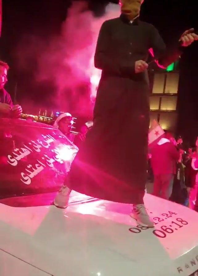 man wearing a tan face covering, black shirt, and long black robe standing on the hood of a white Range Rover in an outdoor environment at night. Red smoke and bright red light are visible in the background. Other people are visible surrounding the car, some holding flags and waving. The man on the hood holds a pole, waving it in the air. There are Arabic words on a red banner leaning against the windshield. A timestamp of "06:18" is visible on the hood of the car. A motorcycle is visible parked nearby. The sound of people cheering and car horns can be heard.