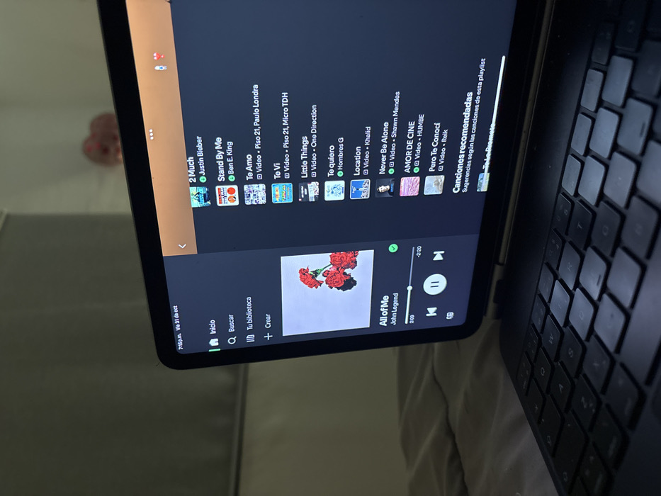 The scene is located in Komchén, Mexico. A tablet computer, equipped with a dark grey detachable keyboard, rests on a light grey, textured fabric surface. The tablet's screen is active and illuminated, displaying a music streaming application interface. The timestamp "7:15 p.m. Vie 31 de oct" is visible in the upper left corner of the screen. The song "All of Me" by John Legend is prominently displayed as the current track, accompanied by album artwork featuring red flowers against a light background. Playback controls indicate 0:09 elapsed time and -2:20 remaining. A list of additional songs or recommendations is visible to the right, including tracks by Justin Bieber, Ben E. King, and others. The background environment consists of a dimly lit, plain light-colored wall. A blurry, reddish object, possibly decorative, is faintly discernible against the wall in the upper right portion of the image. No individuals are present in the frame.