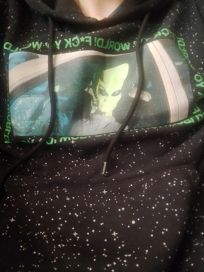The image displays a close-up, frontal view of an individual's upper torso, wearing a black hooded sweatshirt. The specific location within the city of Saint Petersburg, Russia, or any other geographical location, cannot be determined from the visual evidence. The hoodie features a large graphic print on the chest. This print depicts a light-green alien figure with large, dark, almond-shaped eyes and a prominent, elongated forehead, positioned within what appears to be a spacecraft cockpit or a similar confined futuristic environment. The background of the graphic includes shades of blue and grey, suggesting a view of a planet or celestial body from space, or a stylized interior. A neon green border with text, inverted and partially visible, surrounds the central graphic. Observable fragments include "WORLD! F*CK YO..." and "CYO". The remainder of the hoodie's fabric is black, covered with a dispersed pattern of small white dots and occasional cross-shaped specks, simulating a starry night sky or a galaxy. Black fabric drawstrings, tipped with metallic silver ferrules, are visible extending from the neckline of the garment. The top edge of a person's bare neck/collarbone area is faintly visible above the hoodie's neckline. No other individuals or actions are discernible. The immediate environment surrounding the person is not depicted.