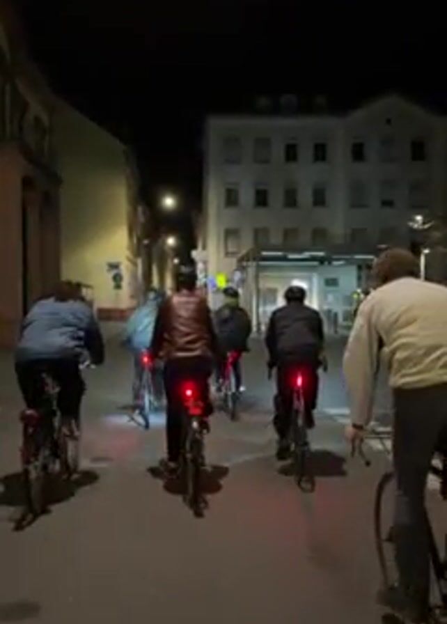 At night, a group of about six bicyclists rides down a street