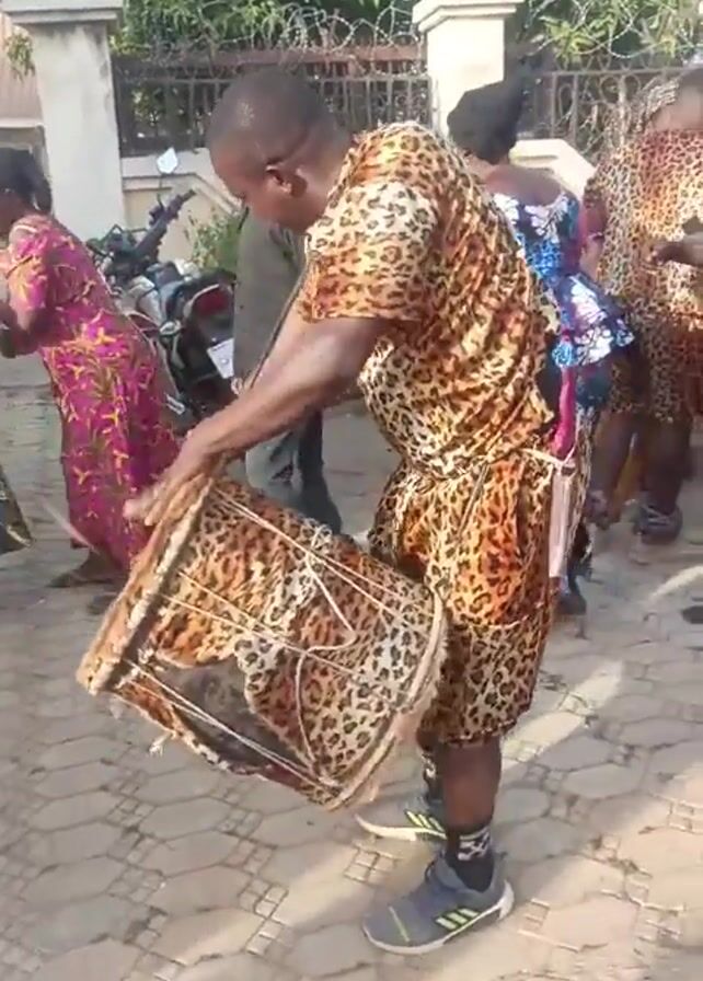 man playing a traditional drum while standing in a paved area. The man is wearing a leopard print outfit consisting of a sleeveless top and shorts, and he has on gray and blue sneakers. He is holding a drum with a similar leopard print design, using a drumstick in his right hand. Several other people are present, some dancing and some observing. They are wearing various outfits, including colorful patterned dresses. In the background, there is a house with a light-colored facade and a red roof, as well as trees and a motorcycle parked nearby. The scene appears to be taking place outdoors during the daytime.