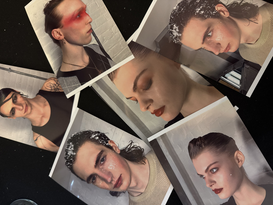 A collection of photographs are scattered on a dark surface. The photos appear to be headshots of models, each with unique makeup and styling. One model has a red stripe across the eyes, another has white flakes in the hair. Two female models wear deep red lipstick and dewy eye shadow. One male model has a sleeked-back hairstyle with dark eyeliner. Another male model showcases a tattoo on his arm.