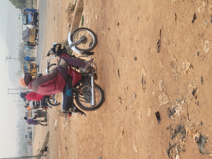 The scene depicts an unpaved roadside area in Kwamba, Nigeria, under a hazy sky with distant hills. In the foreground, a dark-skinned male adult, wearing an orange baseball cap, a two-tone reddish-brown long-sleeved shirt, dark trousers, and sandals, is seated on a red commuter motorcycle with chrome handlebars and front fender. He faces right, with his hands resting on the handlebars. The immediate ground is light brown dirt, marked with tire tracks, scattered dark smudges, white plastic fragments, and dry organic debris. To the left of the primary subject, another male adult wearing a red hoodie stands next to a parked black motorcycle. Further left, a third male adult in a purple shirt is bent over an object on the ground. The midground features additional unpaved areas and various scattered items. In the background, a paved road is visible with several vehicles, including multiple yellow commercial tricycles (keke napep) and at least one sedan. Several other individuals are present along the road. Overhead, power lines and utility poles are visible against the pale sky.